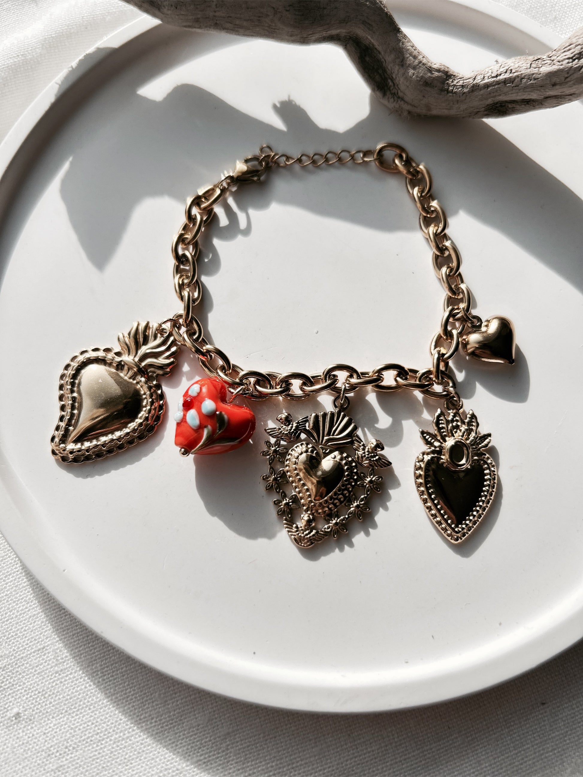 Affirmez votre style avec le bracelet Corazón, une pièce audacieuse qui mêle influences baroques et détails romantiques. Composé de cinq charms en forme de cœurs sacrés dorés, dont un cœur rouge en perles façon Murano, ce bijou raconte une histoire à lui seul. Son design assumé et vibrant en fait un accessoire idéal pour booster une tenue simple ou compléter un look plus travaillé.