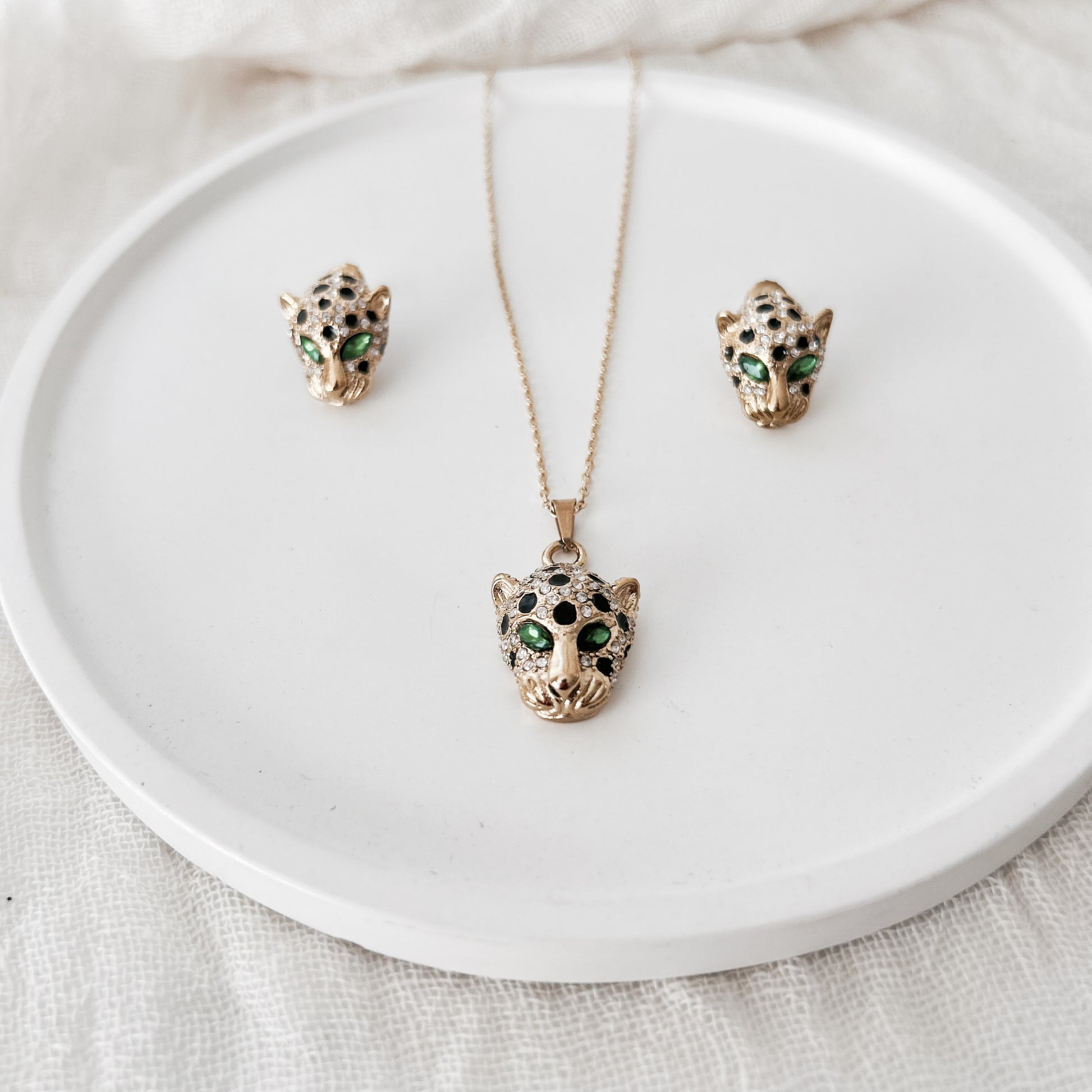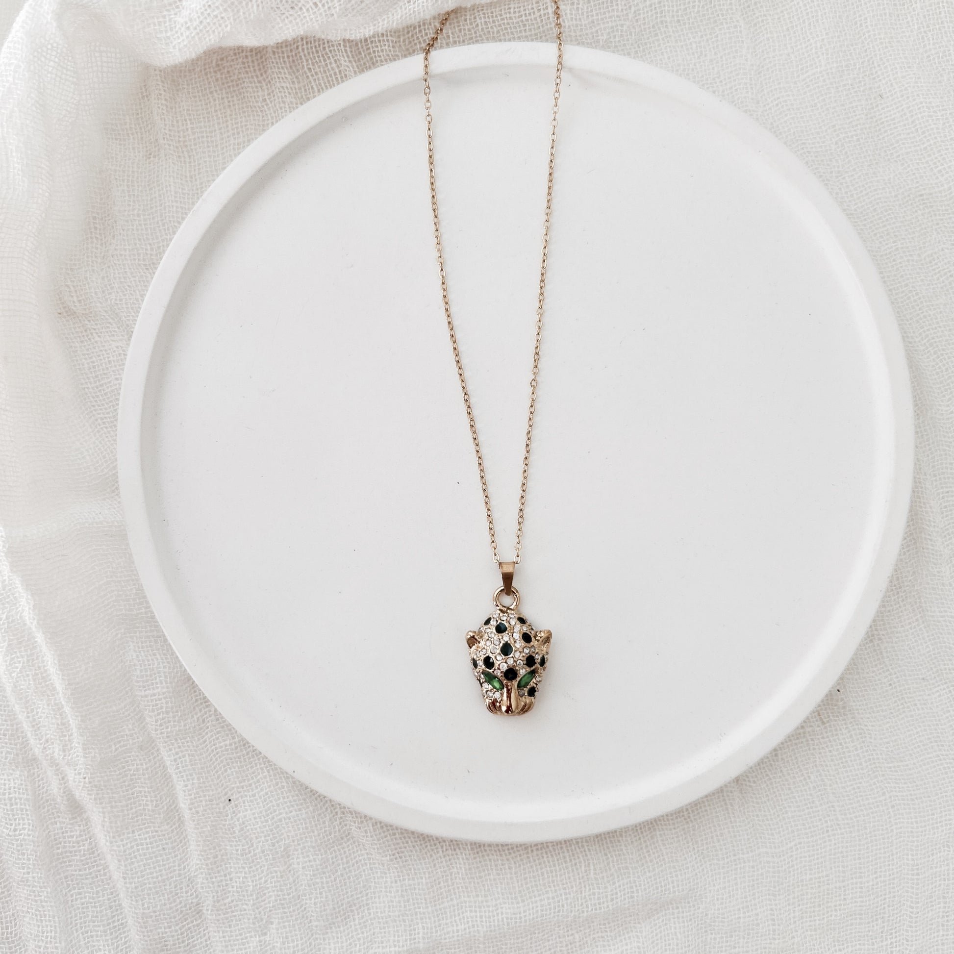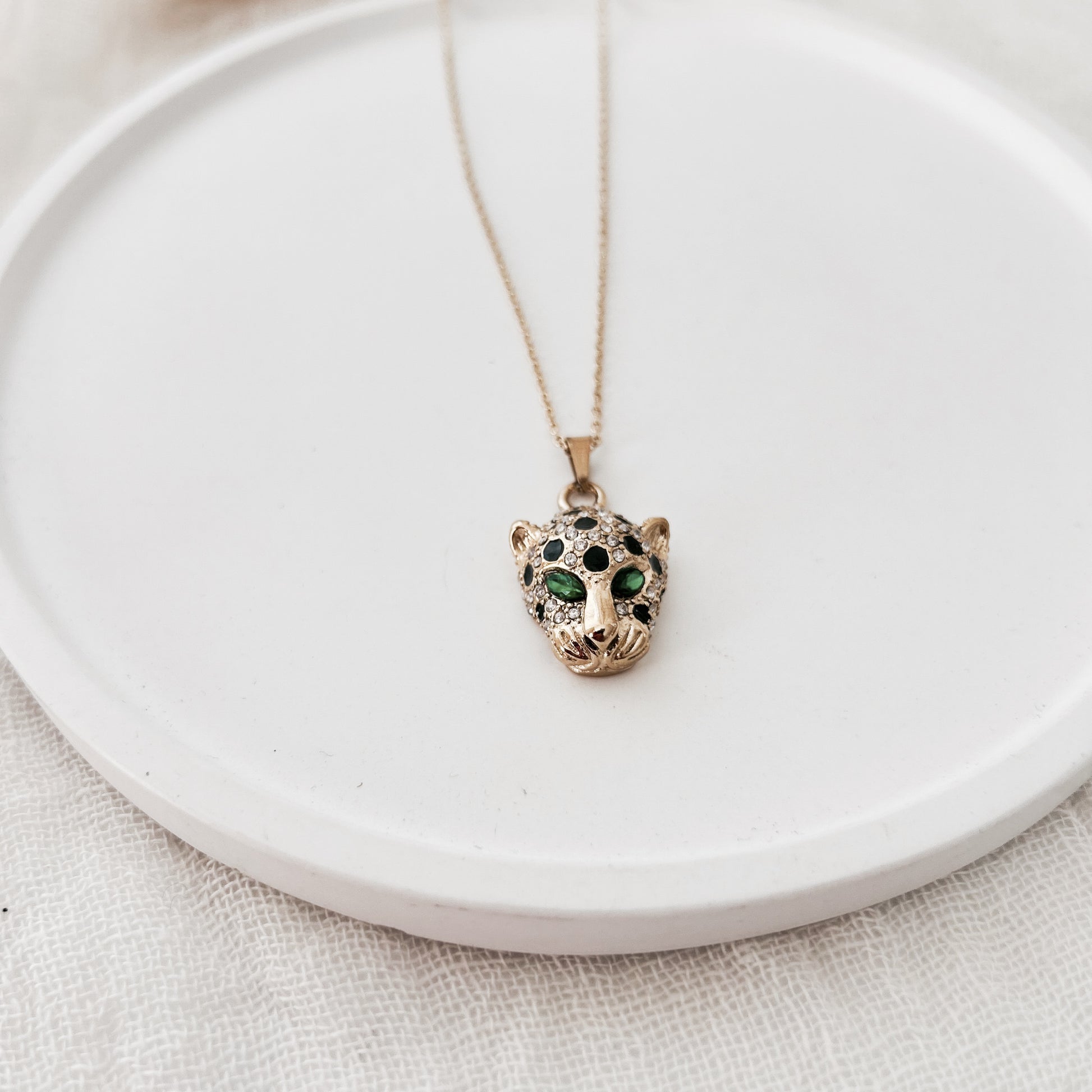 - Pendentif panthère doré orné de strass noirs et verts