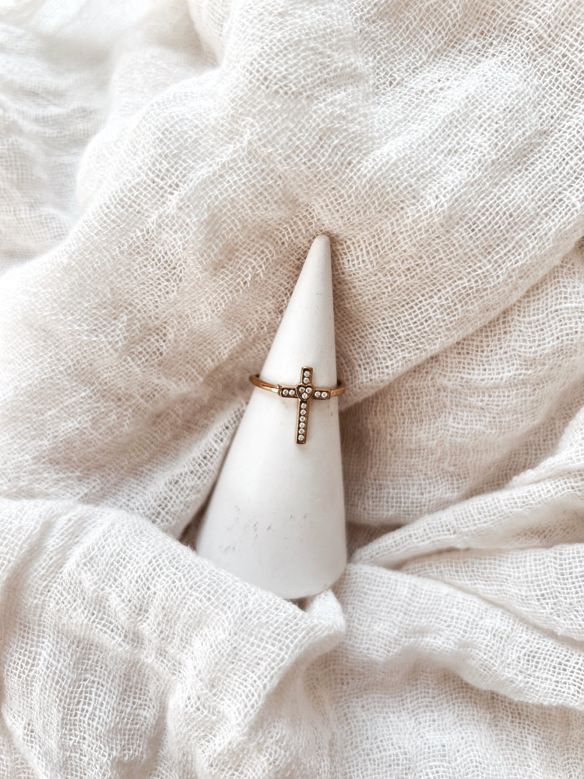 • Bague dorée avec croix sertie de zircons